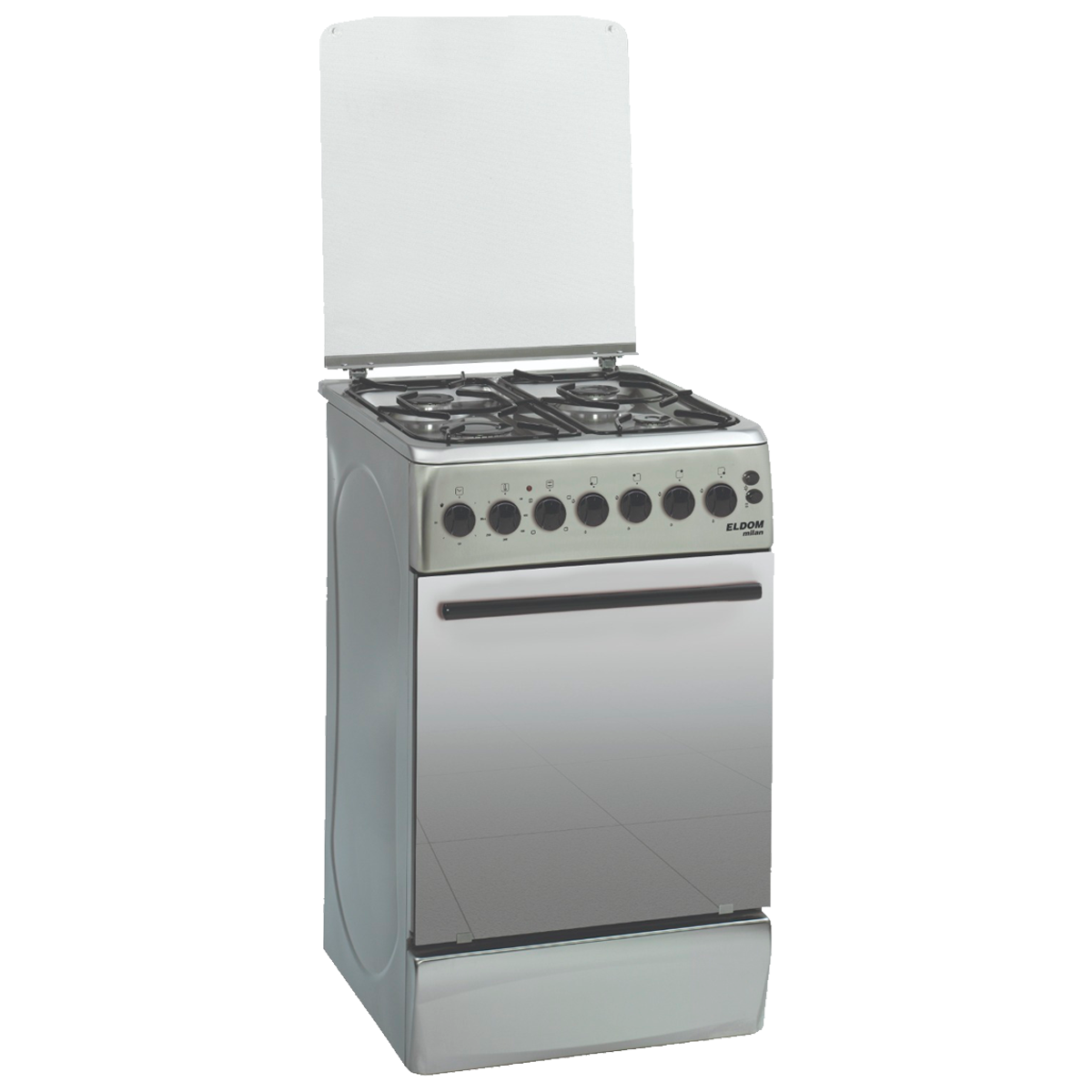 Cocina combinada Eldom Milan 4h. con turboventilador Cocina combinada 4 hornallas a super gas Tapa de cristal Horno eléctrico, doble resistencia blindada Encendido electrónico Doble vidrio en la puerta Termostato Timer con alarma Acero inox mesada y frente total Calienta platos Turboventilador en el horno 1 Parrilla y 1 asadera en horno Patas regulables Puerta horno espejada